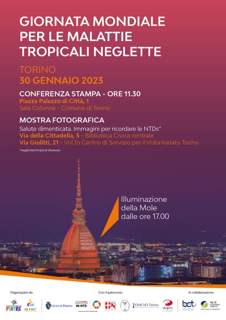 Nella serata del 30 gennaio la Mole Antonelliana, simbolo della città di Torino, sarà illuminata dei colori viola e arancione, a simboleggiare la lotta alle malattie tropicali neglette. Oltre alla Mole, per celebrare questa giornata, 100 monumenti in tutto il mondo saranno illuminati di viola e arancione per sostenere il lancio della campagna “100% Committed to end neglected tropical diseases”, con la quale l’Organizzazione Mondiale Della Sanità (OMS) si pone l’obiettivo di eliminare almeno una NTD in cento nazioni entro il 2030.
