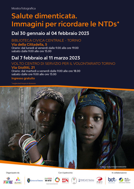 A chiudere l’evento sarà una mostra fotografica denominata: Salute dimenticata. Immagini per ricordare le NTDs* (*neglected tropical diseases) che si terrà dal 30 gennaio al 4 febbraio presso la Biblioteca Civica Centrale di via della Cittadella 5, Torino con orario dal lunedì al venerdì dalle 9 alle 19 e il sabato dalle 9 alle 15, successivamente la mostra sarà trasferita dal 7 febbraio al 11 marzo presso la sede di Vol.To Centro Servizio per il Volontariato, in via Giolitti 21 a Torino con orario dal martedì al venerdì dalle 9 alle 18 e il sabato dalle 9 alle 13, con ingresso gratuito.