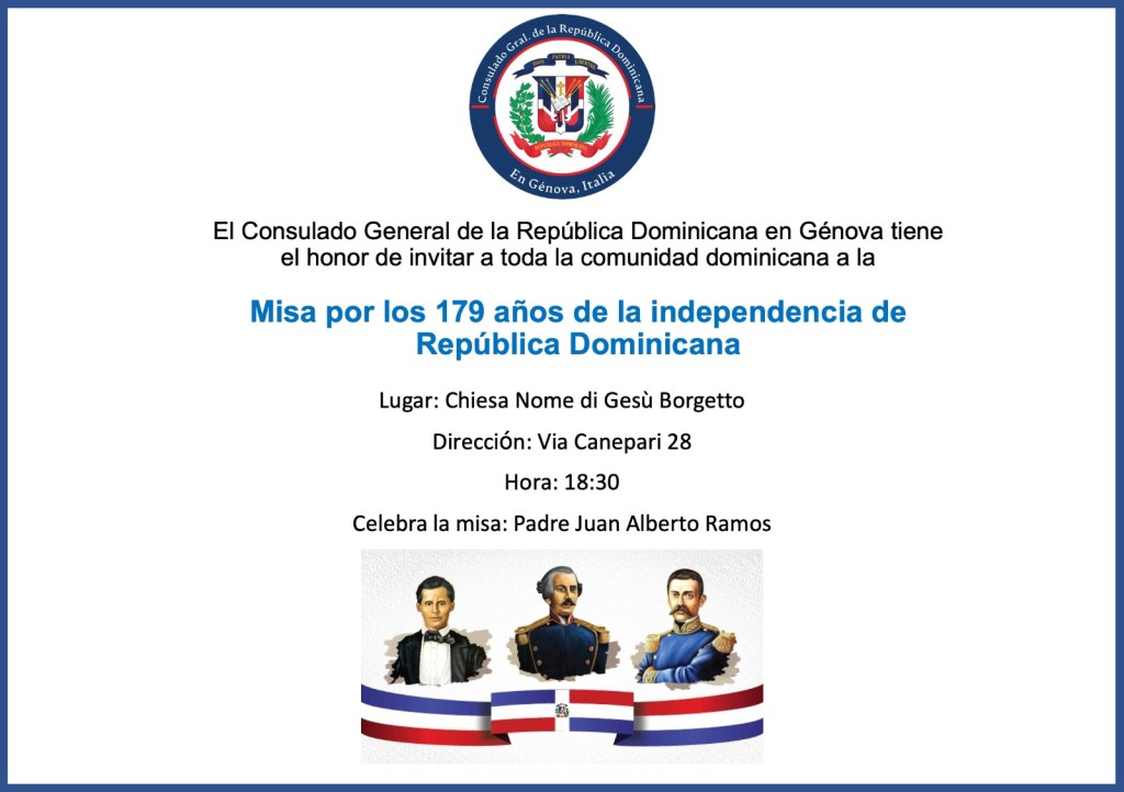 El Consulado General de la República Dominicana en Génova en la persona del Doctor Nelsón Carela Luna tiene el honor de invitarlos a la Misa para conmemorar el 179 Años del aniversario de la Independencia de la República Dominicana.