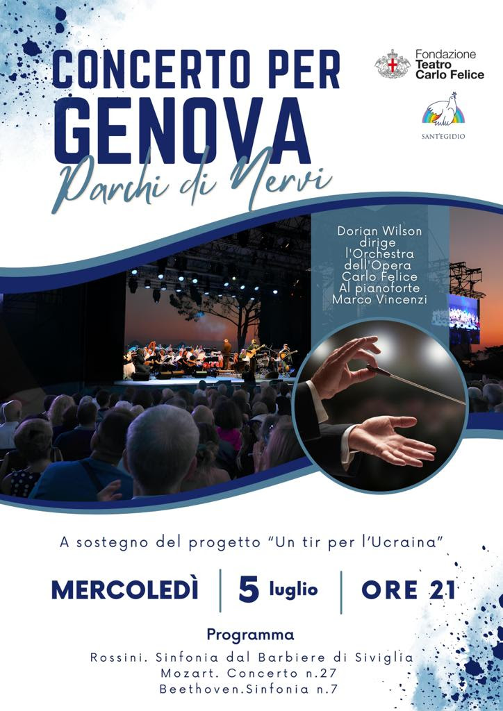 Mercoledì 5 luglio alle 21 nei Parchi di Nervi l’orchestra dell’Opera Carlo Felice si esibirà nel “Concerto per Genova” organizzato dalla Fondazione Teatro Carlo Felice in collaborazione con la Comunità di Sant’Egidio all’interno del Nervi Music Ballet Festival 2023.