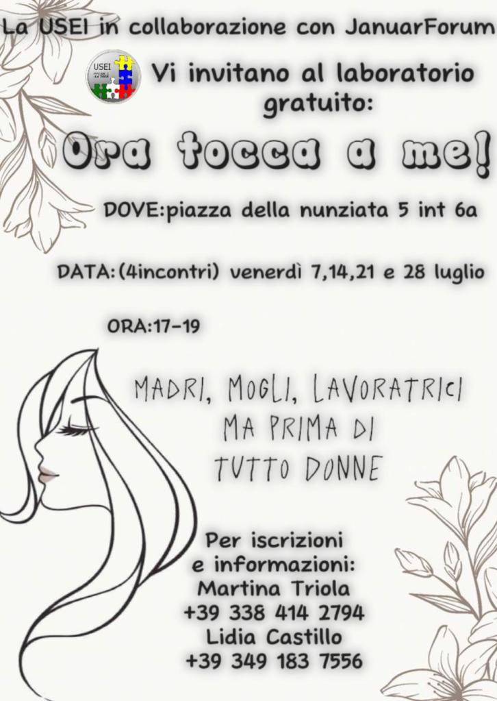 Génova.- Desde el día viernes 7 de julio de 2023, se está llevando en la ciudad de Génova en la Sala di reunión del Palacio Lauro, Piazza della Nunziata 5, sexto piso, en colaboración con el “Foro Januar”, la USEI-APS (Unión de Solidaridad de los Ecuatorianos en Italia) inició el taller ‘Ora toca a me’