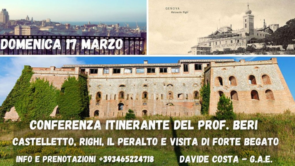 Escursione guidata con conferenza itinerante del Prof. Emiliano Beri docente di Storia Moderna e Storia Militare all’Università degli Studi di Genova: un’occasione unica per conoscere a fondo un patrimonio importante della città di Genova. Partiremo dalla città e salendo verso il Parco del Peralto, da Largo Zecca attraverso le creuze degli antichi conventi arriveremo sul colle di Monte Albano, così come veniva chiamato una volta, occupato per quasi mille anni dal Castelletto e oggi splendido belvedere sulla città vecchia. La nostra metà finale sarà Forte Begato, dove potremo accedere alle aree esterne, rese fruibili dal lavoro dei volontari di Alfa Group Protezione Civile Genova che da anni operano nella cura e valorizzazione dell’importante fortificazione genovese.