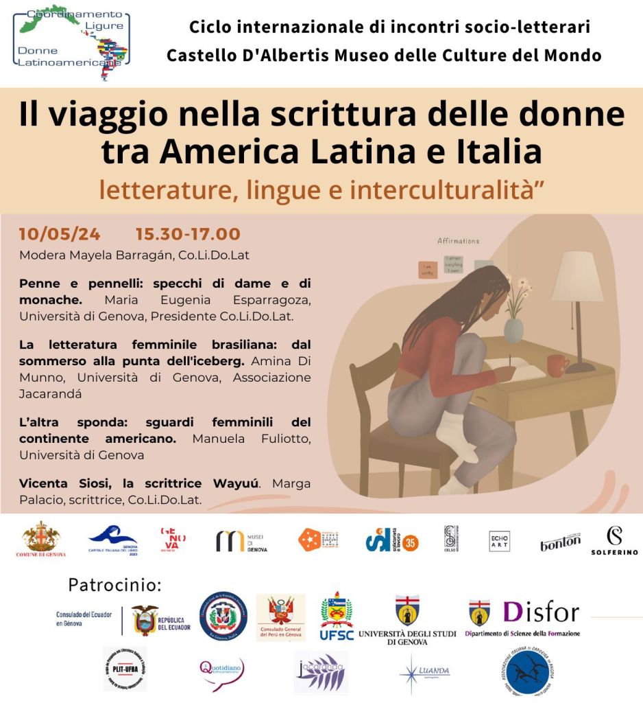 Il Coordinamento Ligure Donne Latinoamericane – Co.Li.Do.Lat. é lieto di invitarVi al Secondo Incontro del 1° Ciclo internazionale di incontri socio-letterari 2024 dal tema: “Il viaggio nella scrittura delle donne tra America Latina e Italia – letterature, lingue e interculturalità” Venerdì 10 maggio dalle ore 15:30 alle 17:00 Presso il Castello D’Albertis Museo delle Culture del Mondo, Genova. Modera Mayela Barragán, Co.Li.Do.Lat Penne e pennelli: specchi di dame e di monache. Maria Eugenia Esparragoza, Università di Genova, Co.Li.Do.Lat La letteratura femminile brasiliana: dal sommerso alla punta dell’iceberg. Amina Di Munno, Università di Genova, Associazione Jacarandá L’altra sponda: sguardi femminili del continente americano. Manuela Fuliotto, Università di Genova Vicenta Siosi, la scrittrice Wayuú. Marga Palacio, scrittrice, Co.Li.Do.Lat Ringraziamo particolarmente la vostra presenza e diffusione.