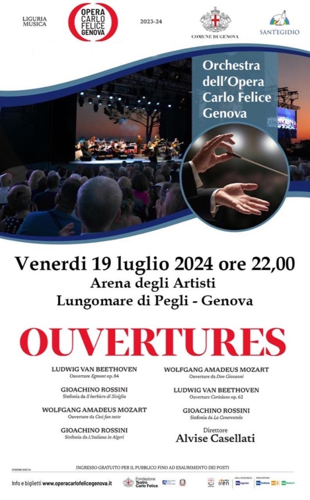Per la rassegna Liguria Musica, Alvise Casellati sarà alla direzione dell’Orchestra dell’Opera Carlo Felice Genova nel concerto Ouvertures. Il programma prevede una selezione di ouvertures e sinfonie d’apertura del grande repertorio operistico e teatrale tedesco e italiano, quali le celebri sinfonie d’apertura della Cenerentola, del Barbiere di Siviglia e dell’Italiana in Algeri di Gioachino Rossini, le ouvertures di Così fan tutte e Don Giovanni dalla trilogia italiana di Wolfgang Amadeus Mozart, e le ouvertures realizzate da Ludwig van Beethoven per la tragedia Coriolano di Heinrich Collin e per le musiche di scena del dramma Egmont di Johann Wolfgang von Goethe.