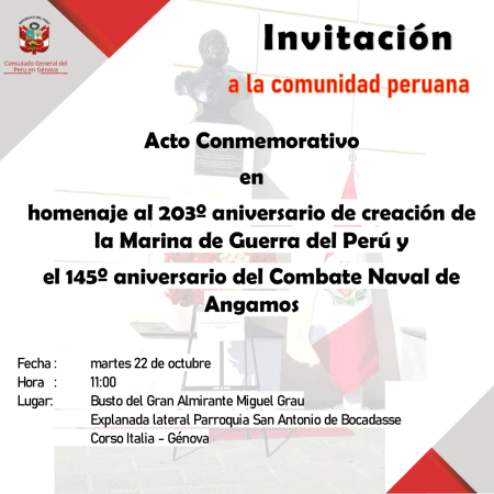 Martedi 22 Ottobre.- Ceremonia commemorativa per il 203° anniversario della Marina Militare Peruviana e del 145° anniversario della battaglia navale di Angamos.