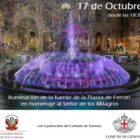 Génova.- Iluminación de la Fuente de ‘Piazza De Ferrari’ en homenaje al Señor de los Milagros