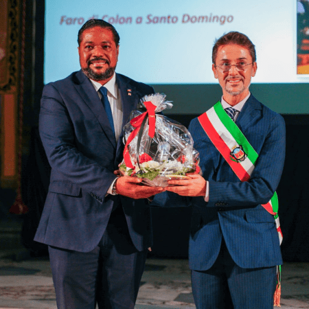 Cónsul General Dominicano Nelson Carela Luna recibe el “Dono dell’Olio” en la Giornata Colombara, en el Palacio Ducal, en Génova, Italia.