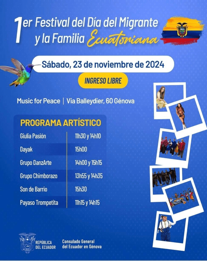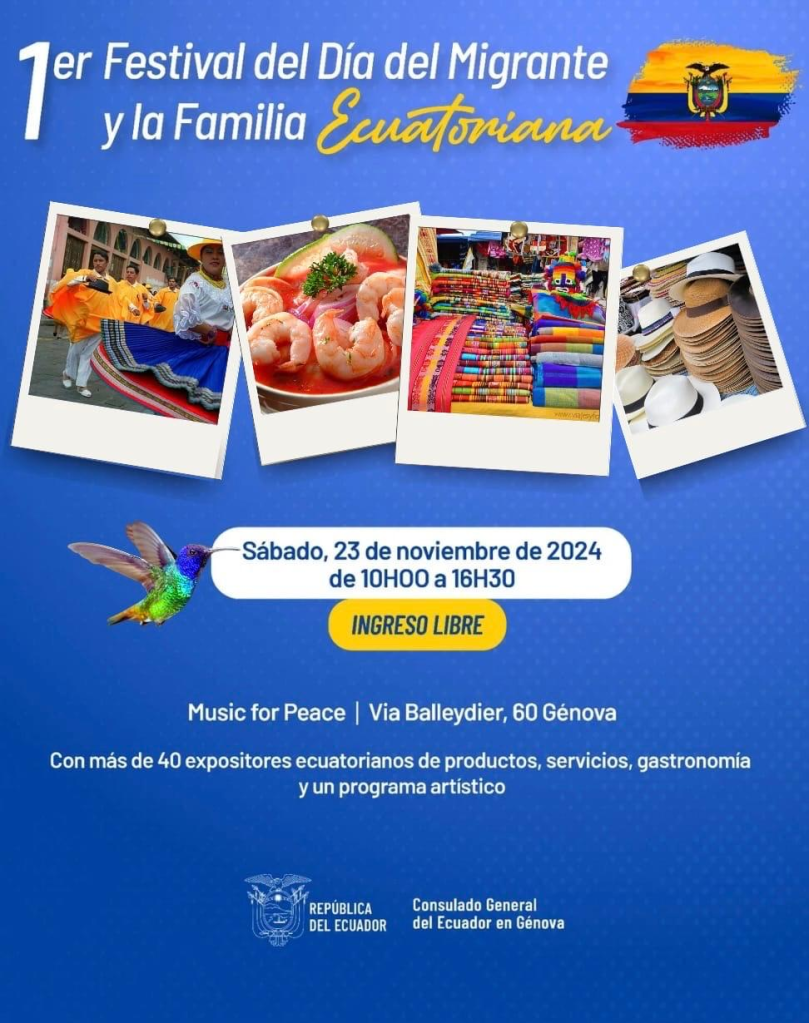 Génova.- El Consulado General del Ecuador en Gènova, en la persona del Ministro Oscar Izquierdo, Cónsul General del Ecuador en Génova, invita a la comunidad en general, Sábado 23 de Noviembre 2024, desde las 10:00 hasta las 16:30 horas se realizarà ‘ Primer Festival del Dia del Migrante y de la Familia ecuatoriana ‘, en el recinto Ferial Music For Pace, Via Balleydier, 60, Gènova en el barrio de Sampierdarena.