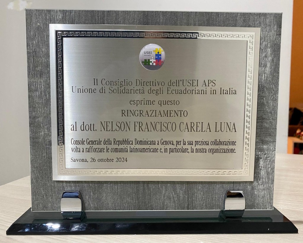Durante el evento, Antonio García, Presidente de USEI APS (Unión de Solidaridad de los Ecuatorianos en Italia – APS), expresó en nombre de la Junta Directiva un sincero agradecimiento al Cónsul por la excelente colaboración establecida a lo largo de los años. Gracias a esta fructífera relación, USEI APS ha crecido como institución y ha podido ofrecer servicios cada vez más eficaces a la comunidad dominicana residente en Savona y sus alrededores.