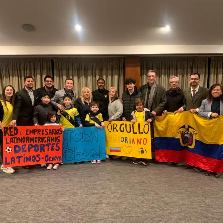 Encuentro entre el delantero John Yeboah y referentes ecuatorianos en Génova: Presente Ministro Oscar Izquierdo, Cónsul General del Ecuador.