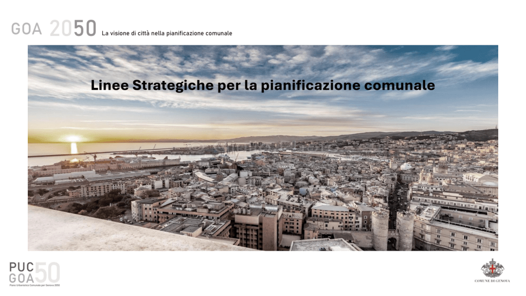 Sono quattro le linee strategiche per la visione di Genova 2050, individuate in coerenza con le linee programmatiche di mandato: Genova smart (promozione dell’innovazione tecnologica, attrazione di nuove competenze, potenziamento del sistema infrastrutturale, valorizzazione delle attività tipiche, sviluppo di nuove infrastrutture digitali), Genova green (mappatura del rischio climatico, promozione della transizione ecologica, fruizione del territorio periurbano, potenziamento del presidio del territorio, promozione della rigenerazione urbana ed extra-urbana), Genova blue (favorire integrazione e interazione porto-città, Zls e retroporto, incremento della fruibilità della cosa, favorire la blue growth, non solo mare ma acqua), Genova friendly (valorizzazione della prossimità e sicurezza urbana, promozione della residenza in aree in abbandono, potenziamento dei servizi, semplificazione delle discipline, valorizzazione del patrimonio storico, culturale e paesaggistico). Le linee strategiche trovano, inoltre, la loro attuazione nella Città dei 15 minuti intesa come strategia per ristabilire connessioni spaziali e sociali, valorizzando le singole identità urbane, frutto del processo di unificazione (1926) di 19 Comuni del territorio genovese che da autonomi furono aggregati a cui si sono poi aggiunti altri sei Comini della Bassa Val Bisagno, annessi a Genova in precedenza (1874).