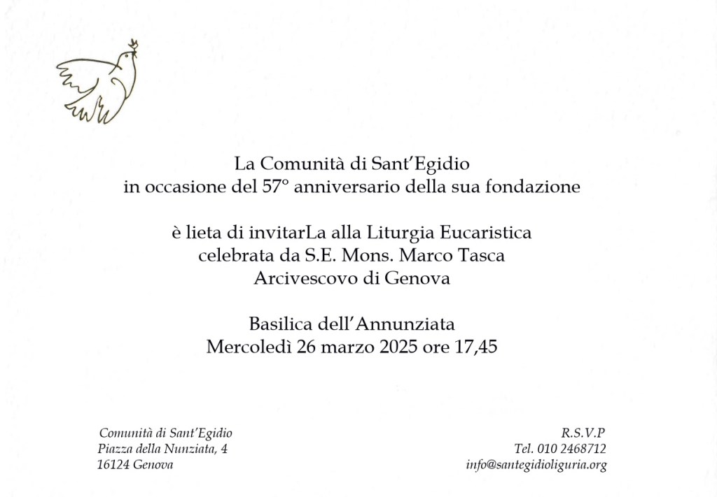Mercoledì 26 marzo, alle 17.45, sarà festa nella basilica della Ss. Annunziata del Vastato, a Genova, per il “popolo” di Sant’Egidio che ricorderà i suoi 57 anni con una celebrazione presieduta dall’arcivescovo di Genova Marco Tasca.