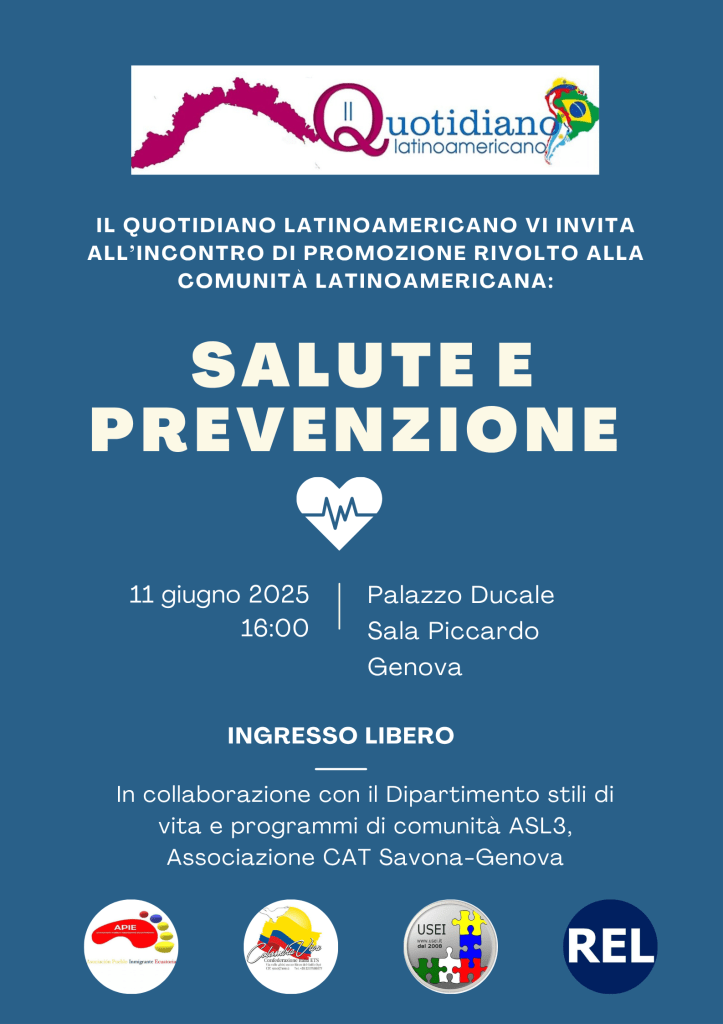 L’evento, a ingresso libero, è organizzato in collaborazione con il Dipartimento Stili di Vita e Programmi di Comunità ASL3 e l’Associazione CAT Savona-Genova, e si propone di offrire un momento di approfondimento e confronto su temi cruciali legati alla salute e alla prevenzione, con un’attenzione specifica alle esigenze e alle peculiarità della comunità latino-americana. A questa iniziativa fanno parte diverse associazione Latinoamericana La USEI Genova – Savona, A.P.I.E., Confederazione Colombia Viva – Italia, Rete Imprenditori Latinoamericani.