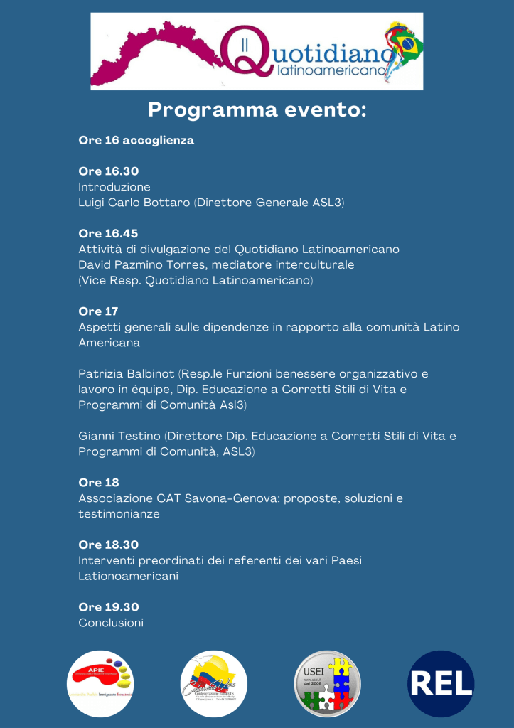 * Ore 16:00 Accoglienza * Ore 16:30 Introduzione a cura di Luigi Carlo Bottaro (Direttore Generale ASL3) * Ore 16:45 Attività di divulgazione del Quotidiano Latino-americano con David Pazmino Torres (Mediatore interculturale e Vice Resp. Quotidiano Latinoamericano) * Ore 17:00 Aspetti generali sulle dipendenze in rapporto alla comunità Latino-americana, a cura di Patrizia Balbinot (Resp.le Funzioni benessere organizzativo e lavoro in équipe, Dip. Educazione a Corretti Stili di Vita e Programmi di Comunità ASL3) e Gianni Testino (Direttore Dip. Educazione a Corretti Stili di Vita e Programmi di Comunità, ASL3) * Ore 18:00 Intervento dell’Associazione CAT Savona-Genova: proposte, soluzioni e testimonianze * Ore 18:30 Interventi preordinati dei referenti dei vari Paesi Latinoamericani * Ore 19:30 Conclusioni