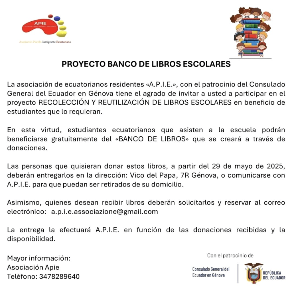 La asociación de ecuatorianos residentes “A.P.I.E.”, con el patrocinio del Consulado General del Ecuador en Génova tiene el agrado de invitar a usted a participar en el proyecto RECOLECCIÓN Y REUTILIZACIÓN DE LIBROS ESCOLARES en beneficio de estudiantes que lo requieran.