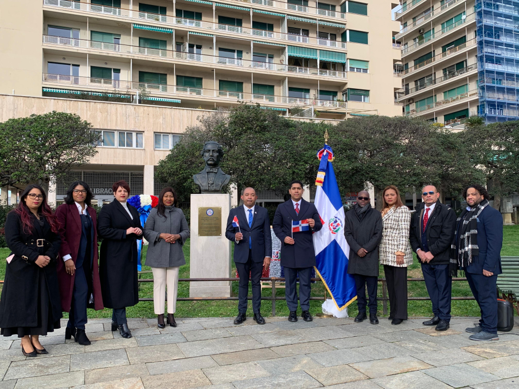 Accanto a loro, il Corpo Consolare dominicano a Genova, riunito per onorare il forgiatore della patria dominicana, nato nel 1813 e riconosciuto come simbolo di libertà, integrità e visione repubblicana.