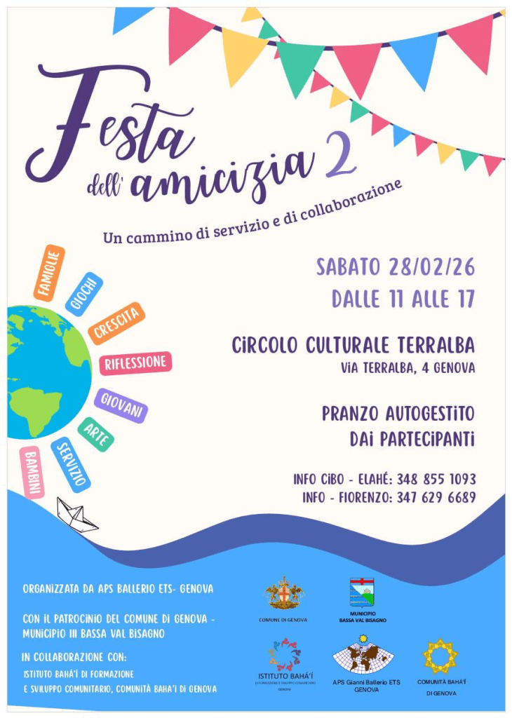 La “Festa dell’Amicizia 2” è realizzata in collaborazione con l’Istituto Bahá’í di Formazione e Sviluppo Comunitario e la Comunità Bahá’í di Genova, con il patrocinio del Comune di Genova e del Municipio III – Bassa Val Bisagno.