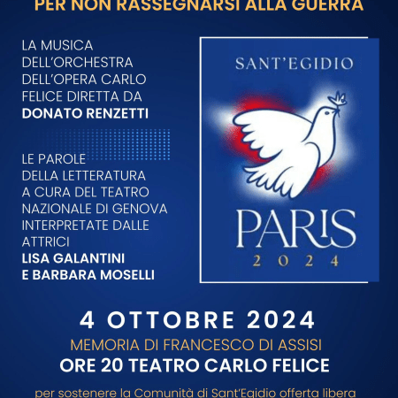 IMMAGINARE LA PACE: venerdì Carlo Felice e Teatro Nazionale insieme a Sant’Egidio per dire no alle guerre e immaginare vie di riconciliazione