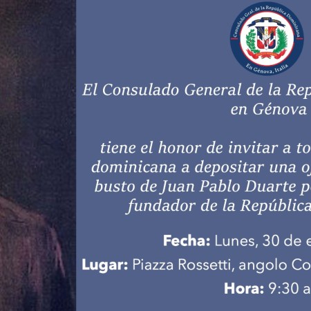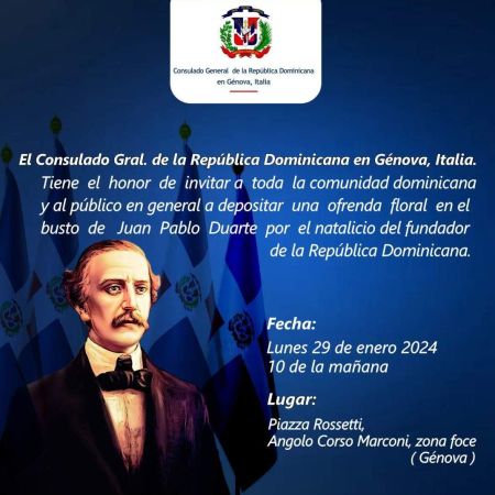 Lunes 29 de Enero en Génova se conmemora los 211 años del Natalicio de Juan Pablo Duarte.