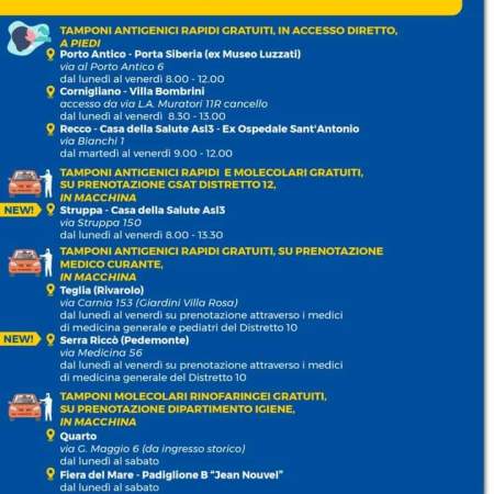 18 novembre 2020 Ivonnetorrestacle ECCO DOVE FARE I TAMPONI IN ASL3. ATTIVI TRE NUOVI PUNTI TAMPONE A BUSALLA, MARASSI E SAN FRUTTUOSO.
